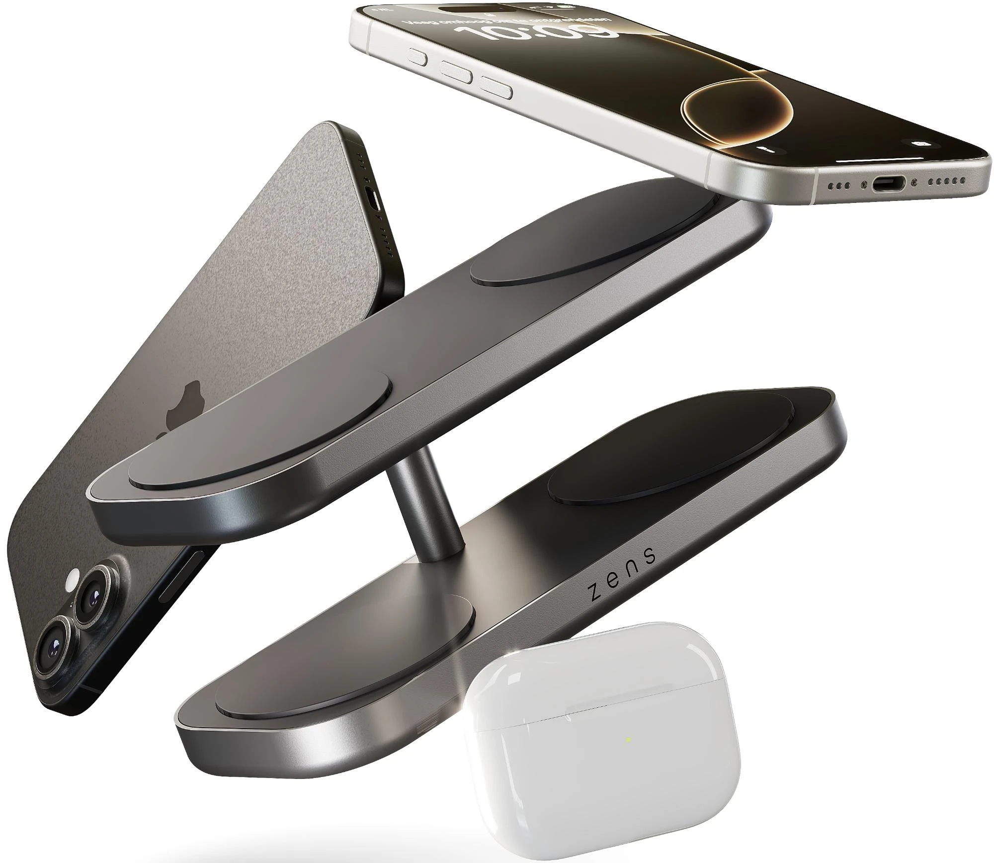 Eine elegante und minimalistische Ladestation, die sich nahtlos in jeden modernen Raum einfügt. Das Zens 4-in-1 Wireless-Ladegerät in Weiß/Silber liefert bis zu 60 W Leistung und hält alle Ihre Geräte organisiert und einsatzbereit.